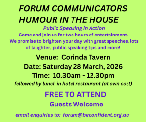 All of our Forums have a variety of speaking activities within their program. This includes tutorials and workshops, short and longer prepared speeches and opportunities for impromptu. The feedback will give you ideas of ways to become a more vibrant speaker.